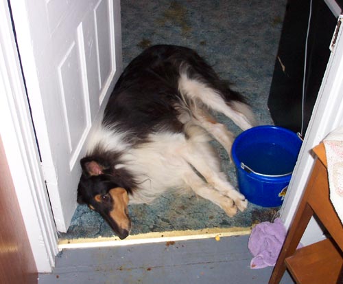 James came down with a mysterious illness with a temperature at 105F! He had my local vet and I puzzled because we couldn't figure out what was wrong. His temp came back down to a high normal and we just monitored his condition and waited for tests to come back. He didn't eat for almost a week, and didn't have a bowel movement for about 5 days. I was force feeding him and watering him and giving him antibiotics to try to help get him better. Sunday, July 18, James took a dramatic downturn with his temp back up to 104F and climbing, he also began vomiting severely at this point. I took James to the emergency vet and they did an x-ray and apparently he swallowed a rock causing a bowel obstruction. He also had aspiration pneumonia and peritonitis. If you would like to see his x-rays, click here... He underwent surgery at about 2 AM on Monday morning 7/19/04 and came out around 3 AM. He came through the surgery just fine and fortunately didn't lose any of his bowel or bowel function. There is a very good chance that if I hadn't brought James in when I did, he wouldn't have made it another day. He Surgery costs & ICU care came to about $3120 which is a LOT more than I have! Add to that the continued medication I need to get to finish clearing up his pneumonia, his follow-up x-rays, the $200 that it originally cost for the first set of tests I had done (long before going to the emergency vet!) and all told I will have way too much into this boy in vet bills when I am done! Fortunately I was able to apply for CareCredit which covered everything, now I just have to figure out how to pay it back!