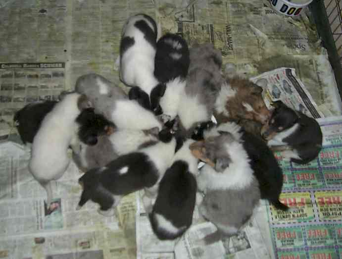 Whole crew and one oddball pigging out! Taken at 4 weeks old... The sable Sheltie is 5 weeks old. They have graduated into the "poopy" stage that with 13 pups to try and keep up with is nearly impossible! They get stinky in a hurry!